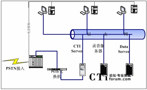 消費(fèi)者撥打訂購電話,經(jīng)PSTN接入到呼叫中心交換機(jī),由CTI服務(wù)器(CTI Server)通過交換機(jī)將話務(wù)分配到相應(yīng)空閑坐席。坐席端記錄訂購信息及消費(fèi)者信息,并將信息存入數(shù)據(jù)服務(wù)器(DataServer)。交換機(jī)對(duì)通話進(jìn)行全程錄音,并存入錄音服務(wù)器。同時(shí)可把進(jìn)入系統(tǒng),但未排隊(duì)到坐席的話務(wù)數(shù)據(jù)記錄存入數(shù)據(jù)庫服務(wù)器,以便回訪。