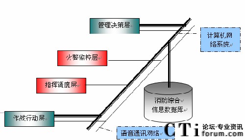 通過對消防安全監(jiān)控指揮中心業(yè)務(wù)的分析,引進先進的數(shù)據(jù)通信網(wǎng)絡(luò)和語音通訊網(wǎng)絡(luò),我們可以將未來的消防業(yè)務(wù)層次抽象地概括為四層(如圖所示):管理決策層、火警監(jiān)測層、指揮調(diào)度層和作戰(zhàn)行動層。與管理決策層對應的組織機構(gòu)為消防通信指揮中心;與火警檢測層、指揮調(diào)度層對應包括消防指揮中心的接處警子系統(tǒng)、指揮調(diào)度等子系統(tǒng);與作戰(zhàn)行動層對應的組織機構(gòu)為消防站(消防隊)和消防車及消防隊員。