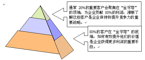 。。從抽象和通用的意義上講,多數(shù)企業(yè)的客戶價值分布是適合"二八法則"的,即20%的客戶創(chuàng)造了80%的利潤。但對每個企業(yè)而言,要洞察"究竟哪些客戶才是最有價值的客戶?""這些客戶在哪些方面的價值最大?""他們有什么共同的特征?"卻不是一件很容易的事。目前,多數(shù)企業(yè)的管理方式還停留在根據(jù)某一項或兩項單一指標(biāo)(如銷售額或利潤)來作的客戶排行,無法進(jìn)行多方位的綜合的客戶價值分析、管理。而要實現(xiàn)"以客戶為中心"的CRM理念,就必須建立一套全面的客戶價值評估管理系統(tǒng),并利用系統(tǒng)強(qiáng)大的數(shù)據(jù)分析、挖掘功能,快速地進(jìn)行客戶群價值細(xì)分管理,建立起客戶價值金字塔。