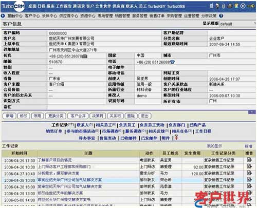 信息整合是CRM系統(tǒng)實現(xiàn)對客戶信息進行管理的基礎(chǔ),將客戶的各類信息進行關(guān)聯(lián),當(dāng)查詢某個客戶時,與該客戶相關(guān)的歷史接觸記錄、交易記錄都可一目了然地展現(xiàn)出來,也可以方便地進行相關(guān)信息的及時錄入。(如下圖)