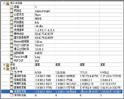 該系統(tǒng)能夠向用戶提供豐富的802.11 a/b/g/n無線參數(shù),包括信號強度覆蓋參數(shù),同頻干擾及鄰頻干擾參數(shù),管理幀、控制幀、數(shù)據(jù)幀及各種無線幀傳輸速率的統(tǒng)計參數(shù)等;系統(tǒng)能基于以上各類統(tǒng)計參數(shù),并通過實時進行各種數(shù)據(jù)業(yè)務測試,獲取網(wǎng)絡的數(shù)據(jù)業(yè)務參數(shù)指標,分析WLAN網(wǎng)絡質(zhì)量問題。