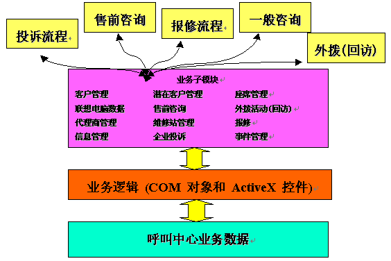 在此中心指導(dǎo)思想之下,惠普咨詢又結(jié)合聯(lián)想電腦公司的業(yè)務(wù)特點(diǎn),所設(shè)計(jì)的呼叫中心涵蓋了廣泛功能,包括:
