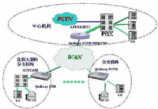 R1760連接PBX或普通電話,實現語音信號在傳統(tǒng)電路交換網絡和IP網絡之間的轉換,為企業(yè)提供高質量、低費用的語音互聯。