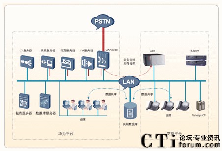 客戶電話通過PSTN統(tǒng)一由華為UAP3300排隊機接入,由華為平臺的IVR服務器進行業(yè)務導航分流,根據(jù)用戶的選擇和IVR流程的配置進行路由,可以選擇不同平臺來處理此業(yè)務。來話根據(jù)IVR流程路由后,兩個平臺采用負荷分擔方式進行工作。在將來話導入兩個平臺后,采用不同設備的IVR進行業(yè)務分配,不同平臺的座席處理不同的業(yè)務。在處理過程中,不同平臺的座席之間可以互轉(zhuǎn),達到全網(wǎng)資源共享的功能。