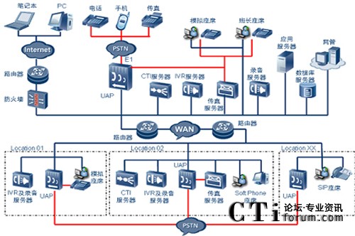 華為多媒體聯(lián)絡(luò)中心提供完善的分布式組網(wǎng)及集中式組網(wǎng)功能,可以提供分布式接入、分布式IVR、分布式錄音系統(tǒng)、分布式坐席、分布式傳真系統(tǒng)及網(wǎng)絡(luò)呼叫中心技術(shù)。如果各個分支機(jī)構(gòu)有較多本地化業(yè)務(wù)需求的時候,各個分支機(jī)構(gòu)只需要再配置一臺CTI服務(wù)器,就可以升級成完整的聯(lián)絡(luò)中心系統(tǒng),可以單獨開展豐富的個性化業(yè)務(wù)。如果總部再安裝一套網(wǎng)絡(luò)呼叫中心,則可以實現(xiàn)聯(lián)絡(luò)中心的互連,即網(wǎng)絡(luò)呼叫中心。