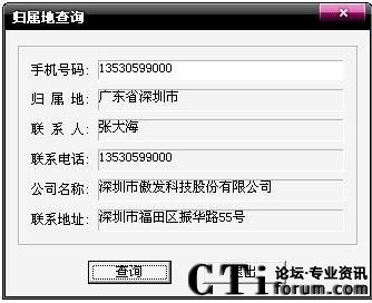 在A8電腦傳真機(jī)的電話商務(wù)通主界面,點(diǎn)擊歸屬地按鈕,出現(xiàn)手機(jī)歸屬地查詢(xún)界面,輸入手機(jī)號(hào)碼,點(diǎn)擊查詢(xún),界面上會(huì)顯示出該手機(jī)的歸屬地,如果此號(hào)碼已在電話簿中,則界面上會(huì)同時(shí)顯示該電話對(duì)應(yīng)的聯(lián)系人信息。