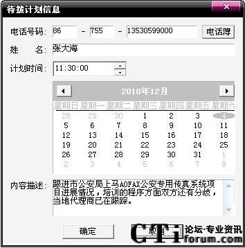 A8電腦傳真機(jī)的通話記錄和通話歷史讓您記住過(guò)去,來(lái)電彈屏和自動(dòng)答錄助您處理現(xiàn)在,待撥計(jì)劃和到時(shí)提醒則幫您安排未來(lái)。點(diǎn)擊電話商務(wù)通主界面中的待撥計(jì)劃按鈕,出現(xiàn)您未來(lái)將要撥出電話的日程安排,您可以對(duì)其進(jìn)行添加、編輯和刪除等操作。時(shí)間一到A8電腦傳真機(jī)會(huì)自動(dòng)彈屏提醒,待撥計(jì)劃中的電話一經(jīng)撥出,A8會(huì)自動(dòng)刪除該電話號(hào)碼。
