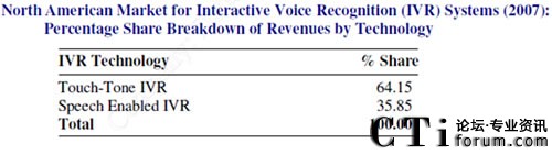 CTI論壇(ctiforum)11月3日消息(記者 楊佳林):根據(jù)Global Industry Analysts, Inc. 2010研究報(bào)告指出, 語音識別每兩年的復(fù)合成長率(CAGR)為97.7%, 其中美, 加占65%。以2007年的IVR銷售營業(yè)額而言, 具有語音識別功能的IVR系統(tǒng)已占有的1/3的比例, 顯示出語音識別系統(tǒng)已逐漸取代瀪復(fù)的IVR系統(tǒng),提供一步到位的服務(wù)。
