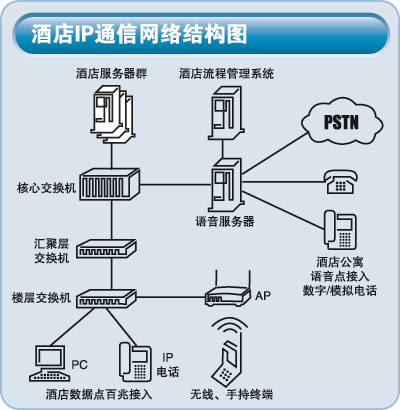 由于IP通信對(duì)帶寬和系統(tǒng)性能的要求并不高,因此可以充分利用酒店原有網(wǎng)絡(luò)架構(gòu),重新劃分VLAN和無(wú)線局域網(wǎng)資源分配,同時(shí)滿足IP電話的通話需求、客房寬帶網(wǎng)絡(luò)的使用,以及無(wú)線接入、移動(dòng)辦公等需求。即獲得優(yōu)化的應(yīng)用又保護(hù)了用戶的投資。