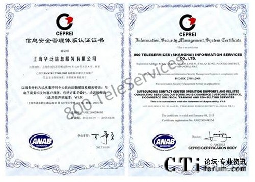 CTI論壇(ctiforum)1月31日消息(記者 浩宇):2012年1月,著名的服務(wù)外包呼叫中心和電子商務(wù)運(yùn)營中心企業(yè)--飛翱集團(tuán)旗下全資子公司上海華泛信息服務(wù)有限公司---,繼2009年獲得ISO9001 質(zhì)量管理體系國際認(rèn)證后。經(jīng)過半年嚴(yán)格的綜合考評,再次成功獲得又一由國際上公認(rèn)的ISO/IEC 27001:2005(也簡稱為:ISO27001)并獲得具有美國認(rèn)證機(jī)構(gòu)國家認(rèn)可委員會(huì)ANAB授予的雙重信息安全管理體系認(rèn)證。