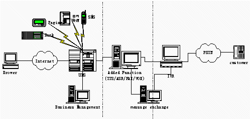 傳統(tǒng)UMS的分散的網(wǎng)民,而IVR, UMS服務(wù)提供商的客戶是企業(yè),系統(tǒng)的使用者則是企業(yè)的客戶(即系統(tǒng)面向下家,由下家為最終客戶提供服務(wù)),分離的模式可以有兩個(gè)獨(dú)立的企業(yè)來(lái)運(yùn)營(yíng)系統(tǒng),IVR Service由具有電信資源的企業(yè)(如:具有接入號(hào),有電信中繼資源,還有CTI系統(tǒng)建設(shè)經(jīng)驗(yàn))運(yùn)營(yíng)。UMS Service由ISP企業(yè),網(wǎng)站門戶企業(yè)等在互聯(lián)網(wǎng)絡(luò)有建設(shè)經(jīng)驗(yàn)的企業(yè)運(yùn)營(yíng)。兩家企業(yè)密切合作。共同提供完善的統(tǒng)一的信息服務(wù)。