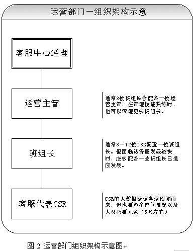 關于團隊的建設,應該首先考慮組織架構的設立。從運營角度講,設置客服中心經理、運營主管、班組長、客服代表都是必須的。當然根據不同的規(guī)模,也可以增加或者減少層級。具體建議請見圖2所示。除了運營之外,對于大型呼叫中心(50坐席以上,或者業(yè)務較為復雜的),也應考慮相關部門的設立。比如客戶關注組,可以負責疑難問題解決、工單流轉、投訴處理、建議處理、知識庫建設采編等等;培訓組可以負責管理、組織、實施員工培訓;技術維護組可以負責系統(tǒng)維護、網絡維護、新項目應用界面開發(fā)、部分系統(tǒng)優(yōu)化;綜合行政可以負責人事、行政等事務。