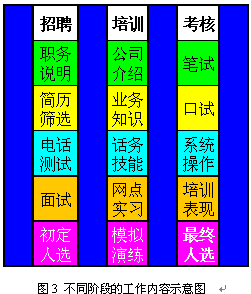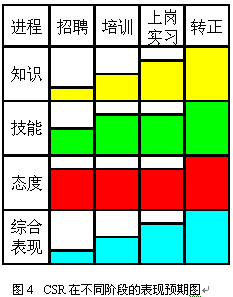 即使經過規(guī)范的上崗培訓與考核,新員工通常也只達到老員工70%左右的表現。因此制定明確的實習期,在實習期間加強指導和培養(yǎng)是非常重要的。通常經過3個月的實習,新員工已經可以達到一個標準,這時便可以轉正了。圖3和圖4表現了不同階段對CSR的不同預期,以及不同階段的主要工作。