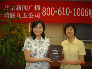 鑒于鴻聯(lián)九五信息處理中信與北京廣播電臺(tái)新聞臺(tái)的合作中所提供的高水平的服務(wù),近期,新聞臺(tái)李臺(tái)長(zhǎng)在聽(tīng)眾見(jiàn)面會(huì)上親自將最佳合作獎(jiǎng)交到鴻聯(lián)九五總經(jīng)理趙薇的手中,并熱切希望開(kāi)拓今后合作,努力走出一條呼叫中心和媒體合作的新路。