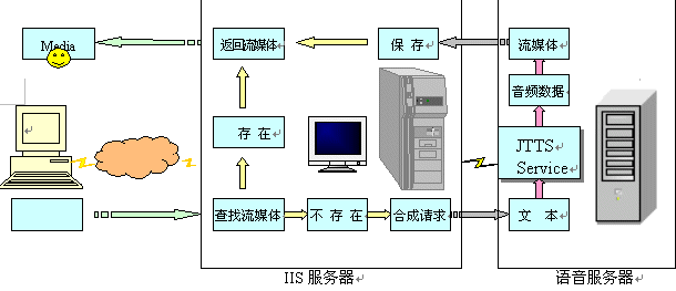 語音服務(wù)器方案是指利用捷通華聲在CTI領(lǐng)域成熟應(yīng)用的jTTS Service語音服務(wù)器,增加一臺或多臺語音服務(wù)器到現(xiàn)有的IIS服務(wù)系統(tǒng)的網(wǎng)絡(luò)環(huán)境中;在IIS服務(wù)器中,增加訪問語音服務(wù)器的功能。當(dāng)IIS服務(wù)器需要流媒體輸出時(shí),向語音服務(wù)器發(fā)出請求,語音服務(wù)器接受IIS服務(wù)器的請求,并對請求的數(shù)據(jù)進(jìn)行合成、格式轉(zhuǎn)換,得到流媒體后返回給IIS服務(wù)器,IIS服務(wù)器再將此流媒體傳輸給用戶。