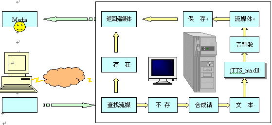 瀏覽器端(Explorer)發(fā)出瀏覽請求,網(wǎng)站服務(wù)器(IIS)根據(jù)請求查找流媒體(音頻流)文件,如有,則將流媒體返回客戶端,并啟動客戶端的MS media player播放流媒體。若沒有,則向語音服務(wù)器(jTTS Service)發(fā)出合成請求,并將所需合成的文本通過Socket接口傳送至語音服務(wù)器;語音服務(wù)器響應(yīng)網(wǎng)站服務(wù)器的合成請求后,將調(diào)用jTTS合成技術(shù)進(jìn)行語音合成,并調(diào)用WMF SDK將生成的音頻文件轉(zhuǎn)換成流媒體格式ASF;通過Socket接口返回IIS服務(wù)器端后,將此流媒體文件存儲到指定的Web目錄,同時(shí)將流媒體返回瀏覽器端,啟動MS media player播放。其流程如下: