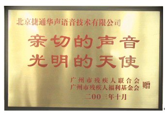 近日,廣州殘疾人聯(lián)合會授予了北京捷通華聲語音技術(shù)有限公司"親切的聲音,光明的天使"榮譽稱號,并頒發(fā)了金匾和榮譽證書,感謝捷通華聲為廣州的社會福利事業(yè)的近10萬元的捐獻(xiàn)與長期的技術(shù)支持。