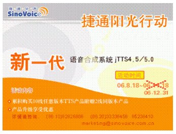 另外,捷通華聲智能技術研發(fā)中心(HCI Center)經過重點集中攻關,終于完成了新一代語音合成系統(tǒng)jTTS5.0的研發(fā)工作。作為捷通華聲2006年的一大力作,此次jTTS5.0在jTTS4.5版本基礎上,在核心算法方面進行了重新設計與改進,使得產品在流暢度、自然度方面有了極大的提升,相信也會帶給用戶不小的震撼。jTTS5.0預計將于近期隆重面市,在2006年12月31前,定購jTTS5.0可以同樣享受“陽光行動”的全部優(yōu)惠政策,歡迎廣大新老客戶一如既往的繼續(xù)支持捷通華聲!與捷通華聲一道共同創(chuàng)造CTI產業(yè)的輝煌!