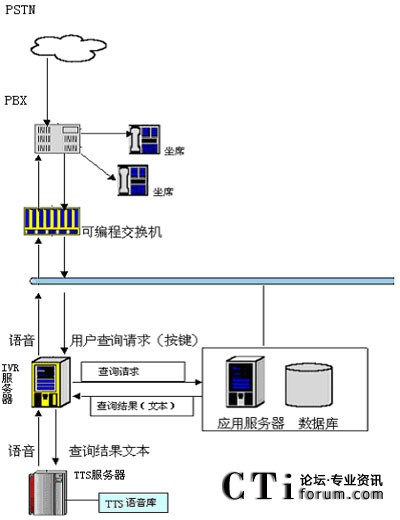 用戶撥打統(tǒng)一特服號碼進入客戶服務(wù)系統(tǒng),經(jīng)過自動語音系統(tǒng)提示,選擇公共信息查詢項目。用戶可以通過電話提交他的查詢請求(比如使用按鍵方式),IVR服務(wù)器收到請求后會向其他應(yīng)用服務(wù)器提交此查詢請求,當IVR得到查詢結(jié)果后,他會將文本形式的查詢結(jié)果交給jTTS服務(wù)器,jTTS服務(wù)器會返回查詢結(jié)果的語音形式,最終語音會在坐席上播放,用戶就可以聽到他剛才所要查詢的信息。