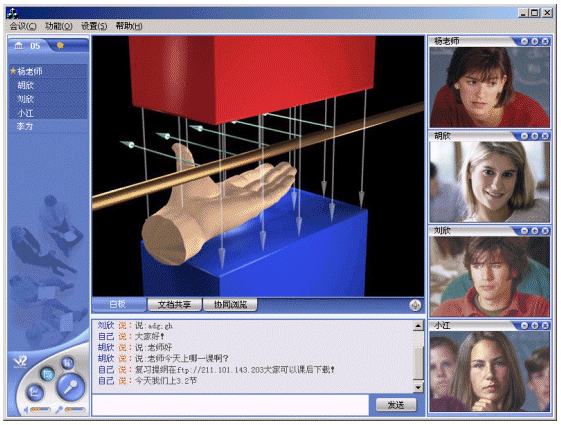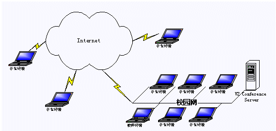 應(yīng)用V2 遠(yuǎn)程教育平臺(tái),教學(xué)和遠(yuǎn)程培訓(xùn)都可以在線進(jìn)行。學(xué)生和教師利用各自的客戶端通過(guò)網(wǎng)絡(luò),進(jìn)入一個(gè)虛擬課堂,在教師與學(xué)生、學(xué)生與學(xué)生之間建立起語(yǔ)音和視頻的雙向交流、課件教學(xué)、在線會(huì)話和白板溝通的環(huán)境,實(shí)現(xiàn)教學(xué)功能。