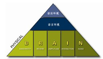 要達到清晰易懂的談話效果需要五個要素的配合:帶寬(Bandwidth)、回響(Reverberation)、振幅(Amplitude)、交互性(Interaction)、噪音水平(Noise)。任何一個會議系統(tǒng)的職責就是自動調節(jié)和平衡這五個要素,使進行交談的雙方都盡可能獲得最佳的聽覺享受。在英文里,我們可以用每個單詞的首字母來記憶這五個特征,即:BRAIN模型。