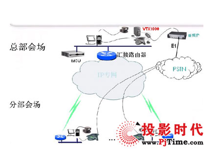 以上拓?fù)鋱D為某單位建立的一套視頻會議系統(tǒng),會場地理條件比較惡劣,計劃組建一套交互式電話會議系統(tǒng)進行擴展,并且音頻及視頻會議可以充份融合的方案。主會場配備一套POLYCOM VTX1000電話會議設(shè)備,主會場程控交換機機房配備一套可行MPS2000音頻橋;其他各分會場只需要分別配備一套POLYCOM SoundStation 2電話會議終端和一條電話線,即可以實現(xiàn)多方交互式電話會議。