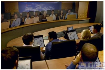 我們之前提到的遠(yuǎn)程呈現(xiàn)產(chǎn)品中前四種都屬于“面對(duì)面”系列。其會(huì)議室布局簡(jiǎn)潔,會(huì)議桌的一側(cè)是座椅,另一側(cè)是等離子顯示屏;會(huì)議連通后,屏幕中將出現(xiàn)近乎真人比例的遠(yuǎn)程與會(huì)者,每個(gè)顯示屏可容納兩個(gè)人,而且屏幕為每個(gè)人都預(yù)留了足夠的活動(dòng)空間,來施展肢體語(yǔ)言。但是,如果你習(xí)慣開會(huì)時(shí)使用白板,并站在旁邊邊寫邊講,那么就需要您在“面對(duì)面”會(huì)議中克服一下了,因?yàn)橐坏┠鷱淖簧险酒饋恚趯?duì)方眼中您將面臨“切頭”的惡果,當(dāng)然遠(yuǎn)程呈現(xiàn)中的雙流功能,可以讓與會(huì)雙方輕松實(shí)現(xiàn)內(nèi)容共享,白板是根本用不上的。