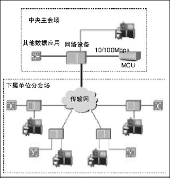 各節(jié)點(diǎn)的接入采用一條512Kbps帶寬的DDN/E1線(xiàn)路接入本地電信公司;在總部采用集中式接入中央電信公司,接入中心的電路帶寬應(yīng)該是多條信道捆綁的帶寬,中心節(jié)點(diǎn)交換機(jī)采用10/100Mbps與MCU相連,總部主會(huì)場(chǎng)的視頻終端通過(guò)接入交換機(jī)與MCU進(jìn)行通信。