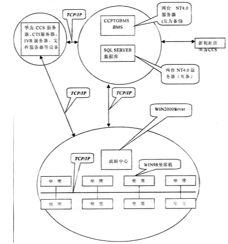 系統(tǒng)采用總部集中模式,前臺(tái)運(yùn)行信雅達(dá)通訊轉(zhuǎn)接程序(CCPTOBMS)和信雅達(dá)業(yè)務(wù)處理程序(BMS)。通訊轉(zhuǎn)接程序從華為接入平臺(tái)接收各類業(yè)務(wù)請(qǐng)求,再轉(zhuǎn)發(fā)至業(yè)務(wù)處理程序。業(yè)務(wù)處理程序與新利處理中心通訊,將各類業(yè)務(wù)請(qǐng)求分類處理。后臺(tái)數(shù)據(jù)庫(kù)選用兩臺(tái)服務(wù)器安裝SQLSERVER7.0,使用OCTOPUS進(jìn)行數(shù)據(jù)備份。