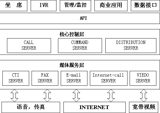核心控制層用于對(duì)來(lái)自不同媒介的客戶進(jìn)行識(shí)別和路由,幫助企業(yè)最大限度地對(duì)每個(gè)連接加以利用,實(shí)現(xiàn)對(duì)所有客戶的全面交互管理,能夠?qū)M(jìn)入呼叫中心的語(yǔ)音呼叫、電子郵件、Web聯(lián)系和傳真通信等所有類型的多媒體交互進(jìn)行路由、通告和告警?梢詫(duì)不同的用戶、不同的聯(lián)系方式進(jìn)行統(tǒng)一調(diào)度和個(gè)性化處理,并集中進(jìn)行管理、定制和用戶來(lái)訪信息的記錄。
