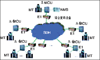多點視頻會議系統(tǒng)主要由視聽多媒體會議終端MT、通信傳輸網絡SDH、網絡節(jié)點的多點控制單元MCU、網絡管理系統(tǒng)NMS以及外圍設備等幾部分組成。由于通信網絡不同,會議電視系統(tǒng)的終端和多點控制單元MCU也不盡相同。例如,對于采用電路交換通信網絡的多點會議系統(tǒng)通過MCU實現,而包交換通信網絡則通過多點會議服務器來實現多方會議。如圖:
