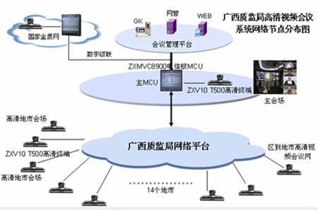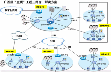 憑借全面的融合通信產(chǎn)品和解決方案、豐富的電子政務工程建設和實施經(jīng)驗,中興通訊為廣西“金質(zhì)工程”(一期)系統(tǒng)“量身定做”出一整套基于IP融合、使用方便靈活的解決方案:將整個系統(tǒng)分為兩個部分,即區(qū)質(zhì)監(jiān)局一級節(jié)點信息中心、各地市質(zhì)監(jiān)局及相關研究機構共計15個二級節(jié)點信息中心,在管理上體現(xiàn)垂直的系統(tǒng)架構。整個網(wǎng)絡可以看作一個分級的星形網(wǎng)絡,結構簡單、易于擴展。