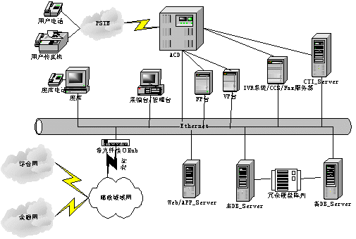 呼叫中心的功能主要有兩方面,一是與用戶進行交互,另外與金融主機房進行數(shù)據(jù)交互。呼叫中心系統(tǒng)由兩部分組成:聲訊平臺(CALL CENTER)和業(yè)務數(shù)據(jù)計算機網(wǎng)絡平臺。聲訊平臺由話務接入設備(ACD)、IVR系統(tǒng)和CTI服務器組成,主要負責語音資源的管理、呼入話務的排隊、自動業(yè)務以及人工座席的管理等;業(yè)務數(shù)據(jù)計算機網(wǎng)絡平臺是對業(yè)務數(shù)據(jù)的收集、使用、管理、分析等。平臺間通過CTI技術(shù)實現(xiàn)數(shù)字數(shù)據(jù)和語音數(shù)據(jù)的相互轉(zhuǎn)換和同步轉(zhuǎn)移。系統(tǒng)結(jié)構(gòu)如下。
