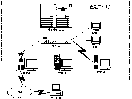 郵政儲蓄金融主機房主要包含金融主機、前置機及網(wǎng)絡通信設施。其結(jié)構(gòu)示意圖如下。