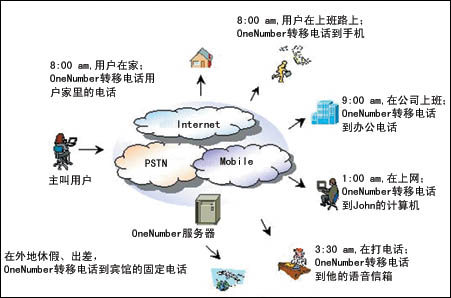通過OneNumber這一業(yè)務系統(tǒng),電信運營商可以整合用戶的各種號碼資源,有效留住客戶;用戶只需申請一個OneNumber號碼,無論用戶走到哪里,主叫用戶都可以通過電話、手機、PC等方式撥打該號碼聯(lián)系到用戶。用戶接受信息的手段可以根據(jù)自己的設定,以電話、手機、短信、PC等方式與主叫用戶建立聯(lián)系,也可以語音信箱的方式收聽留言。