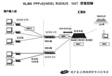 圖2所示的是VDSL技術(shù)與以太網(wǎng)技術(shù)聯(lián)合打造的新型接入方案。武漢烽火網(wǎng)絡(luò)公司生產(chǎn)的S2300系列VDSL交換機(jī)使用戶在現(xiàn)有電話線路上獨(dú)立享用固定的獨(dú)立的帶寬,安全地進(jìn)行數(shù)據(jù)連接,同時以太網(wǎng)的PPPoE認(rèn)證、NAT地址變換等功能又將用戶帶入迷幻的網(wǎng)絡(luò)世界。