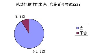 題8的調(diào)查結(jié)果對(duì)于中國(guó)移動(dòng)來講絕對(duì)是充滿誘惑的,高達(dá)91.11%的被訪者表示他們非常愿意嘗試MMS的功能和服務(wù),無疑這對(duì)ICP們(MMS服務(wù)的重要載體)也是一針強(qiáng)心劑啊!
