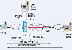 在網(wǎng)通有限公司為中建總公司建設(shè)的網(wǎng)絡(luò)中,當(dāng)用戶撥上網(wǎng)絡(luò)時,網(wǎng)通有限公司的認(rèn)證系統(tǒng)會根據(jù)帶域名的用戶名確定是哪個地區(qū)的VPDN用戶,并通過一系列步驟實現(xiàn)用戶與企業(yè)之間的內(nèi)部通信。
