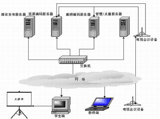 當(dāng)老師端在異地時(攝像頭離服務(wù)器較遠,無法物理連接),可通過“電視會議系統(tǒng)”將老師的圖像及聲音實時傳送到編碼服務(wù)器,桌面課件可以通過PcAnywhere傳送到編碼服務(wù)器。圖像,聲音和桌面課件通過Web Streaming采集壓縮并在網(wǎng)上實時廣播。這種系統(tǒng)架構(gòu)也是當(dāng)今功能比較齊全和完善的一種實現(xiàn)方式。