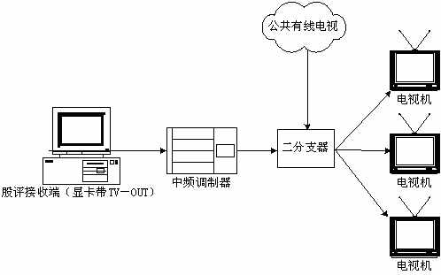 本系統(tǒng)接收端接收實時廣播時,除了用普通PC機收看,或把PC機接收到的信號輸?shù)诫娨暎ù笃粒┥鲜湛,甚至還可以接入有線電視網(wǎng)進行播放。具體方法是通過一個接收端接收股評節(jié)目,通過帶TV-OUT的顯卡把TV信號輸出到中頻調(diào)制設(shè)備,中頻調(diào)制設(shè)備可以把基帶模擬信號轉(zhuǎn)換成一個有線電視信號,且傳輸距離遠,損失小,再把這個信號與有線電視信號一起接入一個二分支器(2進1出),這就可以和公共有線電視共存,形成自己的頻道,供電視接收。