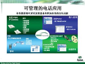 Sonus IP CENTREX解決方案主要基于可管理的語音數(shù)據(jù)綜合寬帶接入網(wǎng);能夠提供話音業(yè)務的應用交換機;能夠提供桌面話音業(yè)務的IP