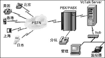 用語音板卡搭建電話會議一般注重在單一的音頻通信?紤]到單純的音頻或視頻會議模式都或多或少有各自的局限性,宇音將數(shù)據(jù)與語音整合在一起,實現(xiàn)音頻/圖文會議。VCTalk各系列電話會議系統(tǒng)采用高性能的語音/會議資源卡作為硬件支持,可實現(xiàn)多方電話會議(≥8),具有多組會議、與會者身份認證、設(shè)置會議主持人、邀請與會者、會議通知、會議內(nèi)容同步播放、會議密碼保護、智能播放、會議內(nèi)容全程錄音/存儲、本地/遠程查聽會議錄音的功能,并可以對企業(yè)內(nèi)部發(fā)生的呼叫記錄進行計費和統(tǒng)計。針對中小企業(yè)辦公靈活的特點,VCTalk系統(tǒng)搭建簡單易行,其結(jié)構(gòu)圖見圖1。