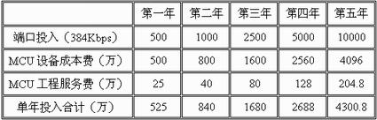 第一年建設500端口MCU,以后根據(jù)用戶發(fā)展情況逐年增加,每端口速率為384Kbps ,每端口設備成本為1萬元,逐年下降20%。MCU工程服務費按照設備費用的5%計算,包括設備運保費、安裝調試費。