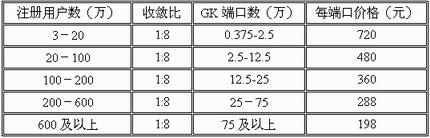 GK的容量與視訊用戶最大放號數(shù)及同時可接入最大視訊用戶息息相關,初期投入的GK視訊終端數(shù)量為商業(yè)視訊用戶2000,個人視頻通信用戶30000 。后期每年商業(yè)視訊用戶和個人視訊用戶每年在前一年基礎上以N倍數(shù)遞增。GK端口數(shù)與實際注冊用戶端口數(shù)按照1:8收斂比進行計算, GK license 價格初期為720元/端口,后期逐年下降,每年為前期的80%。當前GK端口價格以下表為依據(jù):