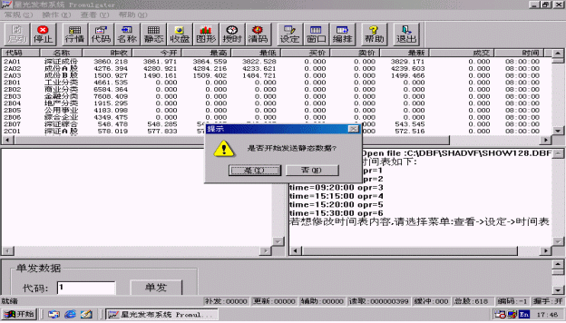 進(jìn)入發(fā)布系統(tǒng)后會(huì)顯示如圖2.2程序主界面,窗口的上面顯示了一排工具按鈕,它們從左至右依次為啟動(dòng)、停止、行情、代碼、名稱、靜態(tài)、收盤、圖形、授時(shí)、清碼、設(shè)定、窗口、編排、幫助、退出按鈕,選擇不同的菜單執(zhí)行相應(yīng)的操作。這些操作執(zhí)行的順序如下: