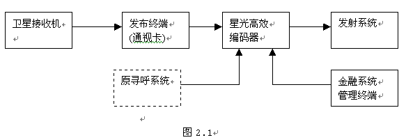 該發(fā)布系統(tǒng)使用通視卡接收?qǐng)D文電視股票數(shù)據(jù),通視卡插在發(fā)布終端電腦中,與衛(wèi)星電視接收機(jī)相聯(lián);發(fā)布程序從通視卡上讀取股票數(shù)據(jù),經(jīng)過(guò)編排處理后傳送給星光高效編碼器,由編碼器編碼后傳送給發(fā)射系統(tǒng)發(fā)射。金融管理終端直接連接到編碼器,負(fù)責(zé)空中開關(guān)機(jī)、催費(fèi)、新聞發(fā)布等工作。