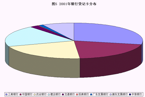 以貸記卡(含信用卡)的發(fā)展舉例:四大國有銀行在2001年還占據(jù)了絕大部分的份額(圖5是2001年貸記卡的分布)。而從2002的下半年起,深圳發(fā)展銀行、招商銀行陸續(xù)推出了頗具市場競爭力的信用卡,廣東發(fā)展銀行等老發(fā)卡行也推出獨特的女性專用"真情卡"等個性化產(chǎn)品,對整個市場有著很大的沖擊。在信用卡發(fā)卡量迅速提升的情況下,工商銀行2002年貸記卡的數(shù)量比前一年減少了160萬張,這也說明了市場競爭的殘酷。