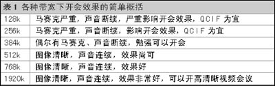 表1各種帶寬下開會(huì)效果的簡(jiǎn)單概括