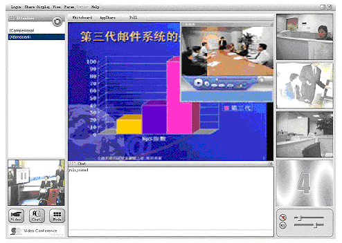 計(jì)算機(jī)、網(wǎng)絡(luò)技術(shù)高速發(fā)展的今天,傳統(tǒng)的通訊方式日益滿足不了人們的要求。人們要求能進(jìn)行遠(yuǎn)程會議,開展面對面的交流;同時(shí),在滿足傳統(tǒng)視頻會議音/視頻通信的基本要求之外,現(xiàn)代會議更希望能夠提供更加豐富多樣的會議討論形式和功能,比如:遠(yuǎn)程開展季度/年度預(yù)算及工作計(jì)劃的討論,需要遠(yuǎn)程共享PPT等演示文檔和EXCEL等表格,需要共同就某一網(wǎng)上信息開展討論,甚至能夠?qū)㈤_會的通知通過電子郵件和手機(jī)短消息的方式傳達(dá)到每一個(gè)與會者那里。