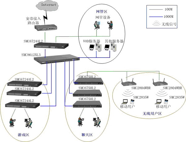 本方案采用"千兆光纖干線,百兆交換到桌面"的設計思路,各骨干線路均為1000M。骨干網(wǎng)通過高速線路接入INTERNET,網(wǎng)吧內(nèi)實現(xiàn)主干千兆交換、百兆到點,整個網(wǎng)吧內(nèi)實現(xiàn)無阻塞通信。根據(jù)顧客的不同消費需求,將網(wǎng)吧分為了網(wǎng)絡游戲區(qū)、聊天區(qū)、貴賓區(qū)等,根據(jù)不同區(qū)域的特點,細化了不同網(wǎng)絡的解決方案。方案中采用的核心設備和二層設備都支持802.1Q標準VLAN和IGMP組播協(xié)議,為VOD、多媒體娛樂等豐富應用的開展打下了堅實的基礎 。通過劃分VLAN,MAC地址綁定來劃分了不同類型用戶,很好地滿足網(wǎng)吧的各項業(yè)務應用需求。此外,SMC的豐富無線網(wǎng)絡產(chǎn)品可以很靈活的滿足網(wǎng)吧的組網(wǎng)需求,投資少、施工快。在提供高性能的同時,還保證很好的安全性,既支持基于802.11b標準的安全機制,又支持動態(tài)安全鏈路,以及基于802.1x的增強性安全或認證功能。